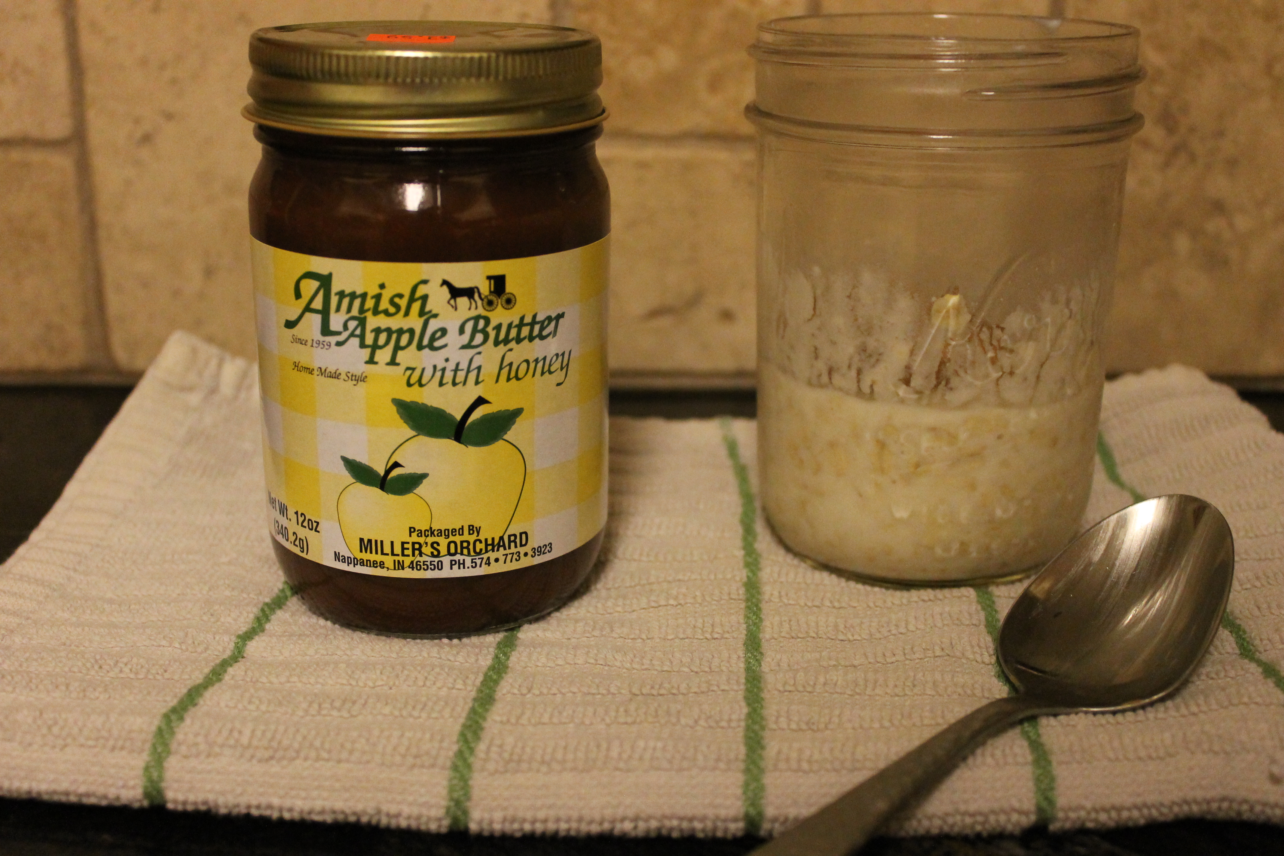 Overnight oats made with 1/3 cup quick oats, 1/4 cup milk, 1/4 cup plain yogurt, a dollop of peanut butter, and a generous spoonful of delicious apple butter!