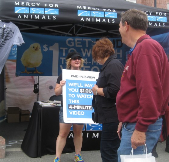 The last thing we did is leaflet. I don’t have a picture of me doing that. Leafleting means passing out brochures to people as they pass by. Some people don’t have a clue what you’re giving them, some people take it and give it back and some people thank you for the information. I gave out a lot of brochures. What I found is asking, “Would you like some information on vegetarianism?” is an easy way to pass out a brochure versus saying, “Help stop factory farming.” or “Help stop animal cruelty.” While these are all causes we support sometimes a softer apporach works well with people to get them interested in what message you are delivering.